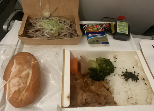 フィンエアー機搭乗後、間もなくして機内食が配られました(↓)。エコノミーだから簡易なのはわかるけど、そばとパンとご飯って炭水化物多くないか?(笑) お肉はビーフをチョイス。