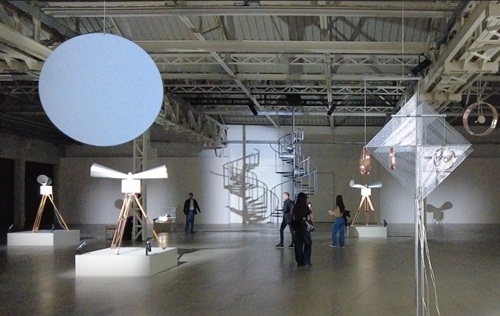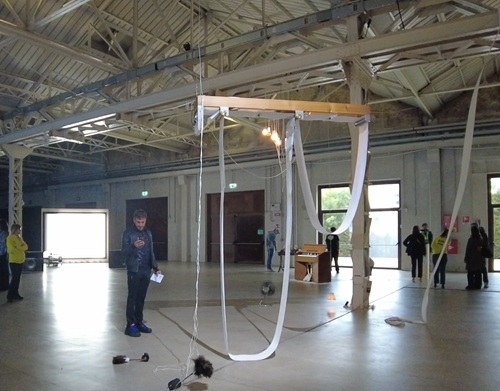 1980年神奈川県生まれの美術家で、フランス・リヨンやインド・コーチ=ムジリスのビエンナーレや、横浜のトリエンナーレなどに出展経験のある方だそうです。ゴム手袋やハタキ、タライや洗濯ばさみなど、日常生活で目にするもので作品を構成し、電気、磁力、空気の動きなど、目に見えないエネルギーの存在を示す作品が、ピレリの倉庫を改造した空間に展示されていました。