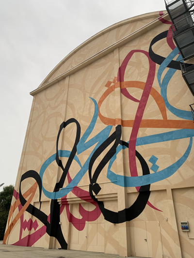 倉庫の裏に回ると、こちらには期間限定の壁画が(↓)。アラビア語なのかな? 巨大で迫力がありました。ミラノには、こうした企業の財団が運営する美術館がいくつもあるそうです。プラダ財団は有名ですね。