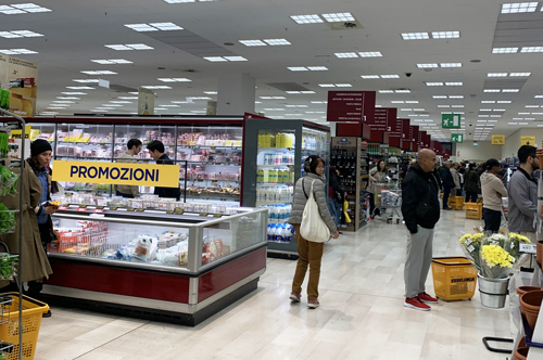 この後、Mさんに連れて行ってもらったのは、大型スーパーのEsselunga(↓)。入り口で専用端末を受け取って、選んだ品物のバーコードを読み込んでいくと、合計金額が表示されるという仕組みでした。会計はセルフレジで。