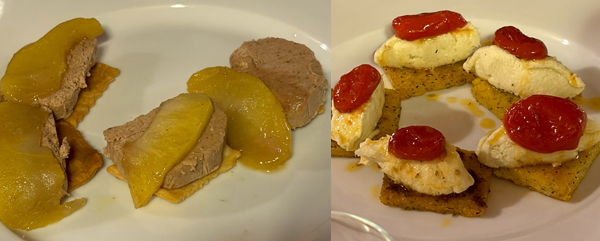 アンティパストはこの2皿。洋梨を載せたパテと、ドライトマトを載せたチーズのカナッペかな?