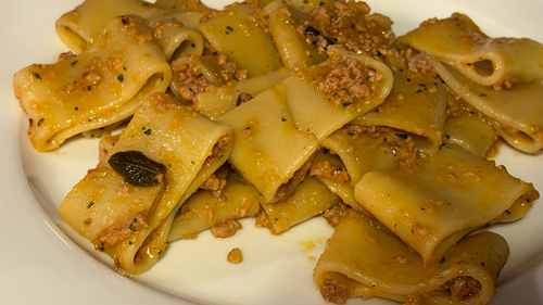 プリモピアットのパスタは幅広いパッパルデッレ(↓)と