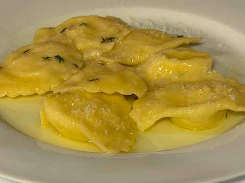 ラビオリ(↓)。今回は北部から中部にかけての旅だったので、詰め物入りのパスタが多かったです。
