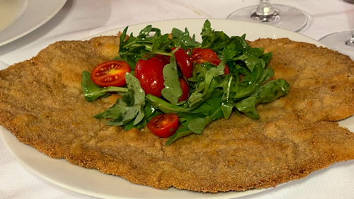 セコンドピアットは「Kさんリスト」によるとミラノ風カツレツ。が、お店の人によると「あんなに薄いカツはない」とのことなので、お店独自のカツレツ(↓)を持ってきていただきました。確かにミラノ風より厚いかな?