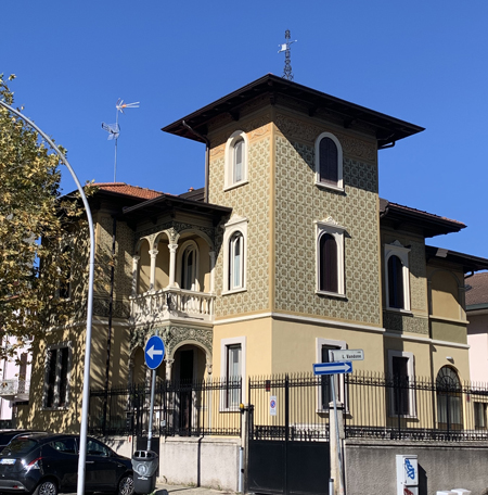 私は「行ったことのない場所に行きたい!」と希望したので、ヴィジェーヴァノ(Vigevano)という、人口6万人ほどの美しい町へ。駐車場のそばの民家がこれ(↓)ですから、豊かな地区であることがわかります。壁の装飾もバルコニーも美しい💛