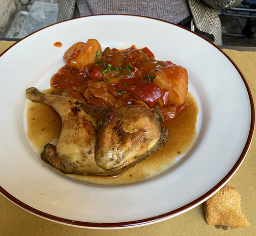 出てきたときは量の多さに怯えましたが(笑)、スプーンを入れたらすぐに底に着いたので安心。セコンドピアットはこの旅行で最大の失敗をしちゃいました。Mさんは鶏肉のローストにトマトソースだったのですが(↓)