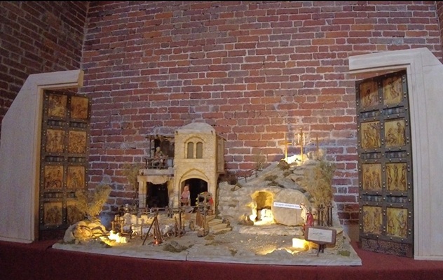 こちらにはキリスト生誕の際のベツレヘムを表したプレゼーピオが置かれていました(↓)。手前にあるのはフィレンツェのサン・ジョヴァンニ洗礼堂にある天国の扉っぽいですが、新約聖書のイエス・キリストの生涯を描いているようです(天国の扉は旧約聖書の物語を描いています)。