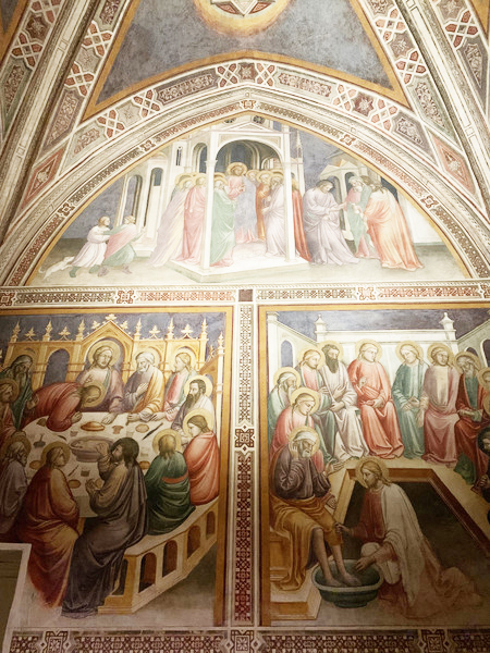 で、その店舗がすごかった(↓)。教会の一部を使っているようで、14~15世紀の壁画が残っているのです。左下は最後の晩餐、右下は弟子の足を洗うイエス。