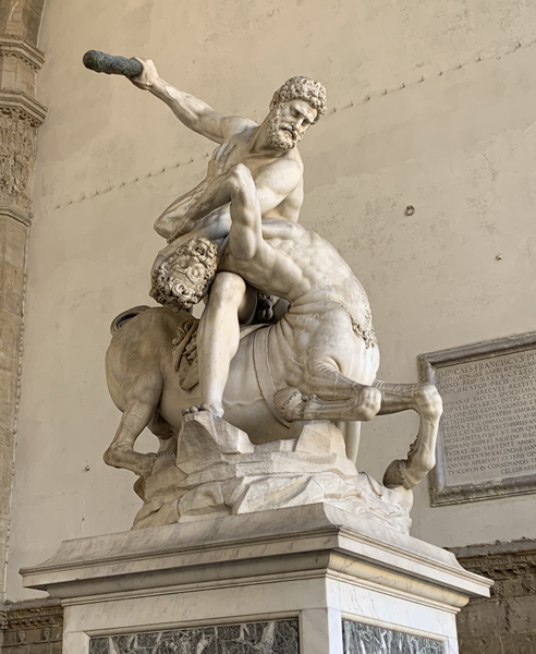 16世紀の彫刻家、ジャンボローニャによるヘラクレスとケンタウロス(↓)。妻を奪おうとしたケンタウロスのネッソスに棍棒を振り上げる瞬間です。ネッソスが死に際に妻に渡した媚薬(実際は毒薬)のせいで後にヘラクレスは死んでしまうんですよね。