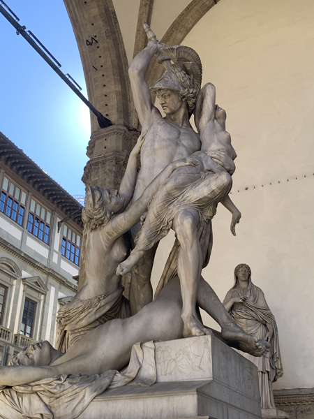 ランツィ回廊にある彫刻の一つ、ペルセウス像(↓)。掲げているのは彼が倒したメデューサの首です。16世紀の彫刻家、ベンヴェヌート・チェッリーニ作(レプリカ)。